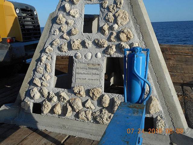 Two memorial reef modules were deployed on the memorial site. The Kyle Wahl Memorial Module remembers Kyle who passed away from cancer at the age of five. Kyle’s memory was kept alive through the dedicated efforts of his mother, Sasha, and Bruce Hrobek, who sponsored a fundraiser for Kyle’s module at Billy Bones Bait and Tackle. The second memorial module was dedicated to Shirley Starbird Dubois, a 39-year veteran teacher of the Orange County School System, who had been a two-time cancer survivor and moved to Fort Pierce in 2008. Memorial reefs are a great way to remember individuals while serving to enhance the environment which they loved. The program wishes to offer its condolences to these families and prayers in remembrance of their loved ones.