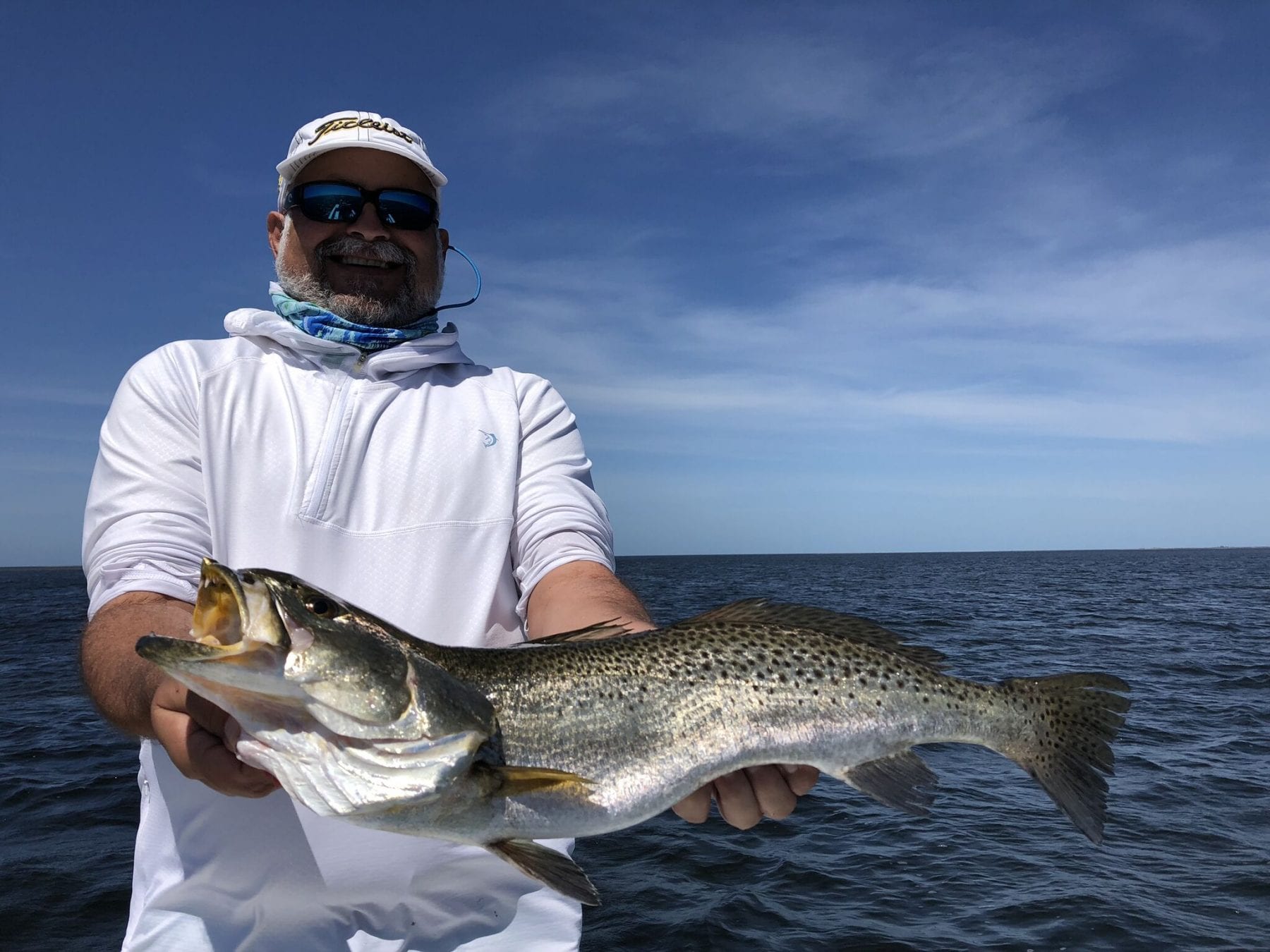 The trout will begin to move in from the deeper flats, and start staging around the inshore bays and creek mouths. Unfair Lures Smack Sticks in root beer, are a great option to fish under a popping cork. I prefer about a 25-inch leader between my cork and jig head, and this setup will fish effectively in 3 to 6 feet of water. Look for areas with mixed sand and grass. Fish any transitions from sand to grass, or grass to rock, and that’s where you will find the trout laid up. Of course, live shrimp or pinfish are always solid options for trout in the fall.