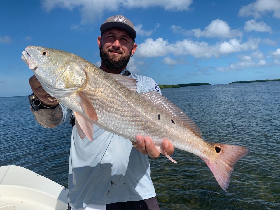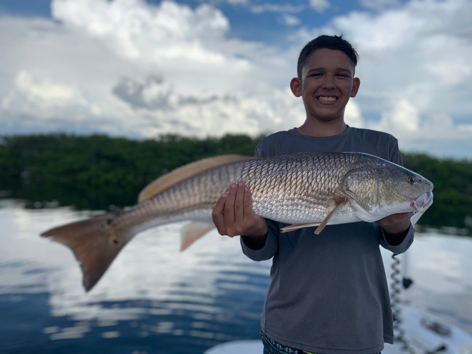 Redfish are pretty much everywhere. I’ll start most days just looking for mullet. Usually I don’t even have a specific spot that I’m going to fish. I just look for mullet. The very beginning of the incoming, or the outgoing tides are always the best. Live baits are always a good choice, along with some cut bait. Artificial is also a good choice, and Mirrordines and DOA Jerkbaits are great.