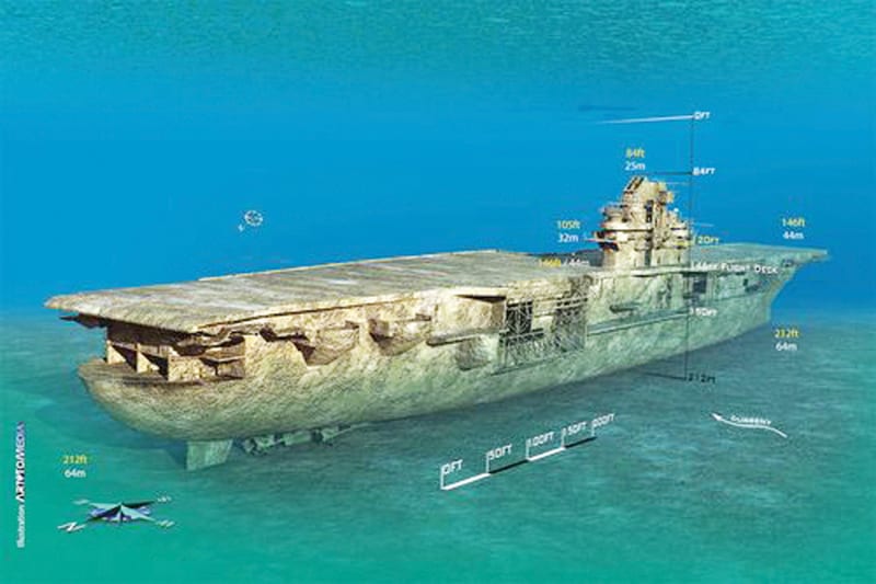 With the fairly recent discovery of the HMS Hermmes off of Sri Lanka, there are now three divable aircraft carriers in the world. But first you have to get to Sri Lanka. There is the USS Saratoga in Bikini Atoll. This ship is way out in the south Pacific. Then you have the USS Oriskany right here in the northern Gulf of Mexico, just south of Pensacola Florida. The Oriskany truly is a “bucket list” dive. Sitting upright on the bottom at almost 14 stories high, 150 feet wide, and nearly 900 feet long, the Oriskany has been billed as the world’s largest artificial reef. It is massive. I knew even before she went down that the sheer size of the wreck would lend itself to being its own ecosystem. And I was right. The wreck was immediately populated with bottom dwelling and reef fish. It wasn’t long before the pelagics found her. It is not uncommon to see whale sharks and manta rays on the Oriskany. She sits in 212 feet of water about 23 miles south of Pensacola. This site was chosen to maintain the 65 feet of clearance needed above the wreck. The depth of the wreck created some controversy as many wanted it to be shallower. The superstructure was prepped for divers. The vast majority of insulation and wiring were removed so as not to create entanglement hazards. Many doorways were welded open, and some additional egress points were cut into many of the rooms of the superstructure, in an effort to make the superstructure safer for divers. Below the flight deck these precautions were not feasible as the hull is 900 feet long. We treat the wreck as you would a wall in the Caribbean. Bottomless diving, unless trained and equipped you just don’t go to the bottom. I believe the depth of the wreck has been a deterrent to many penetrating the wreck and no doubt has saved some lives. The hangar bay doors are a mere 30 feet beyond the flight deck, but as you look into this massive, square, cave like maw of an opening that beckons you into the interior of the hull, you realize you are at 175 feet under the ocean on your single outlet aluminum eighty, and it is probably not a good idea to go inside.