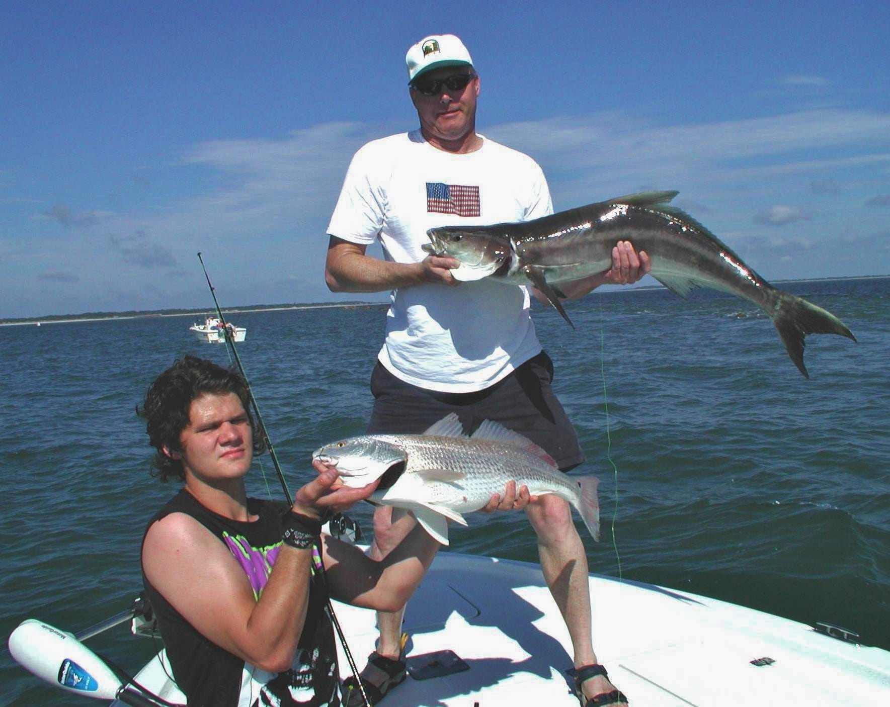 Cobia weighing to 80-pounds will hold close to working shrimp boats, channel buoys and close to the surf where large concentrations of menhaden are schooling. Offshore fishermen will also find cobia following hooked bottom fish up to the boat often completely catching fishermen off guard. Jetty and bay fishermen will also hook up with hard fighting cobia while fishing on the bottom with blue crabs, menhaden, mullet and large shrimp as well.