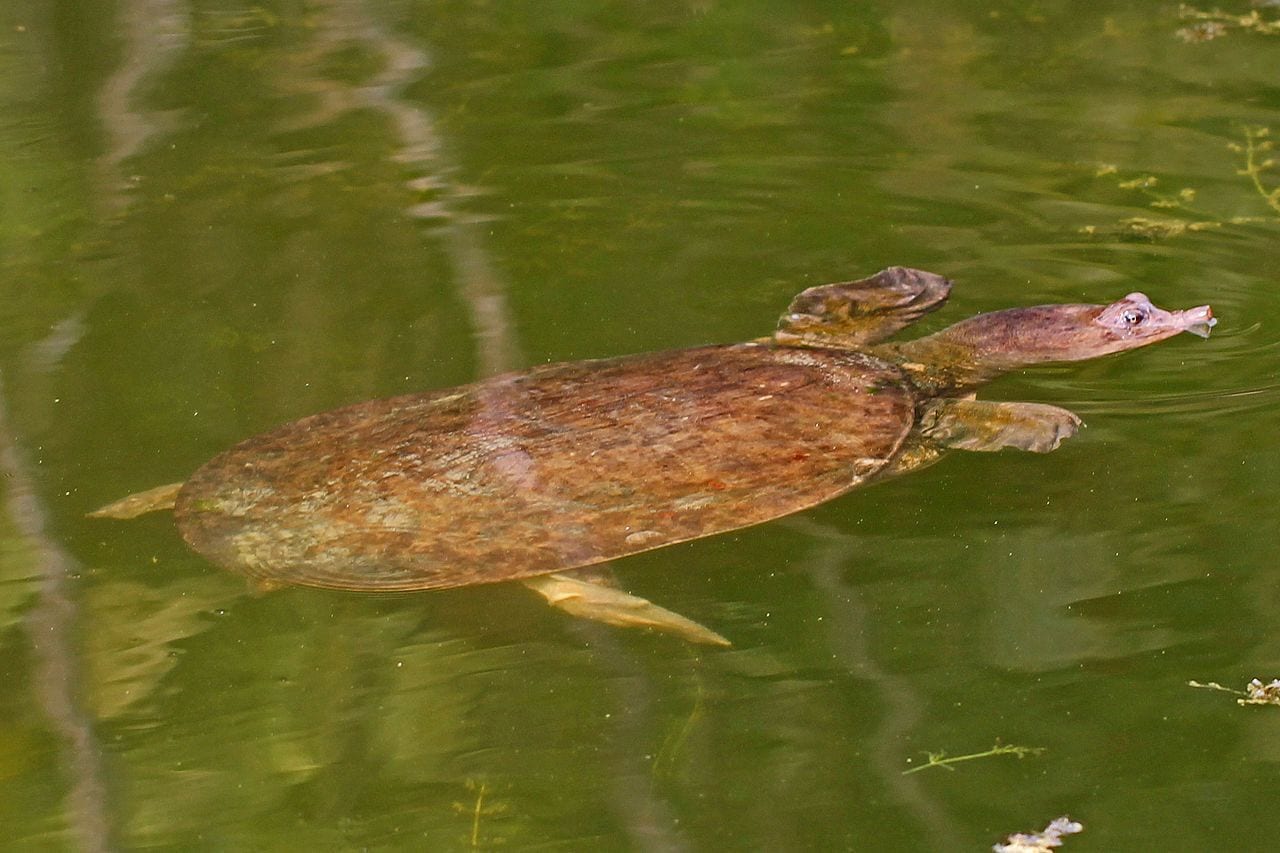 A softshell turtle swimming along