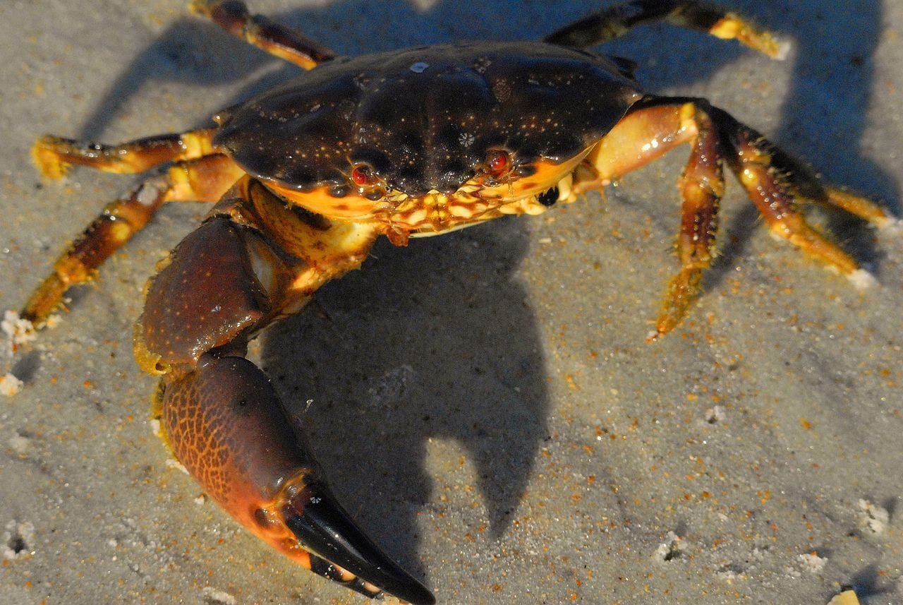 The Florida stone crab (Menippe mercenaria) is found all around the state and throughout the Gulf of Mexico and the Bahamas. The shell or carapace can reach six inches in width, and the color of the crabs is usually brownish red. The claws are unequal in size and have black tips. The crabs like to eat oysters and small mollusks and worms. Their enemies include sea turtles, grouper, horse conchs, octopuses, and – of course – fishermen.