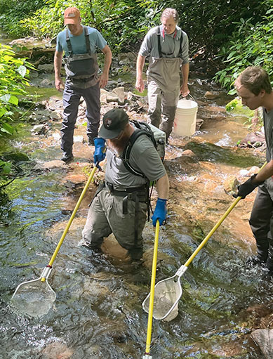 Streams were sampled using a standardized protocol to collect fish from a 100-m section blocked off by nets to contain all fish in the section. Depending on stream width, 1 – 3 backpack electrofishing devices that generate high voltage are used to apply electrical current into the water to temporarily stun fish allowing technicians to collect them with dip nets. Each section is sampled three times which provides an estimate of the total number of fish in the section. Scientists with the University of Tennessee assisted with sampling and collected salamanders that were also stunned during electrofishing.