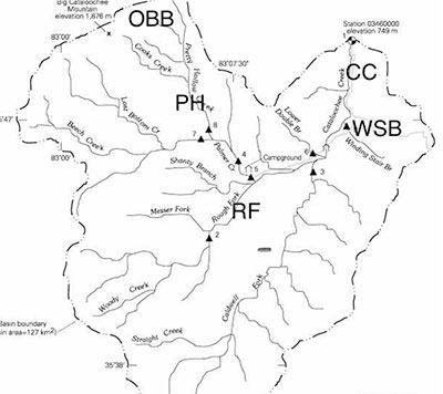 Cataloochee Creek (CC), Winding Stair Branch (WSB), Rough Fork (RF), Pretty Hollow Creek (PH), and Onion Bed Branch (OBB).