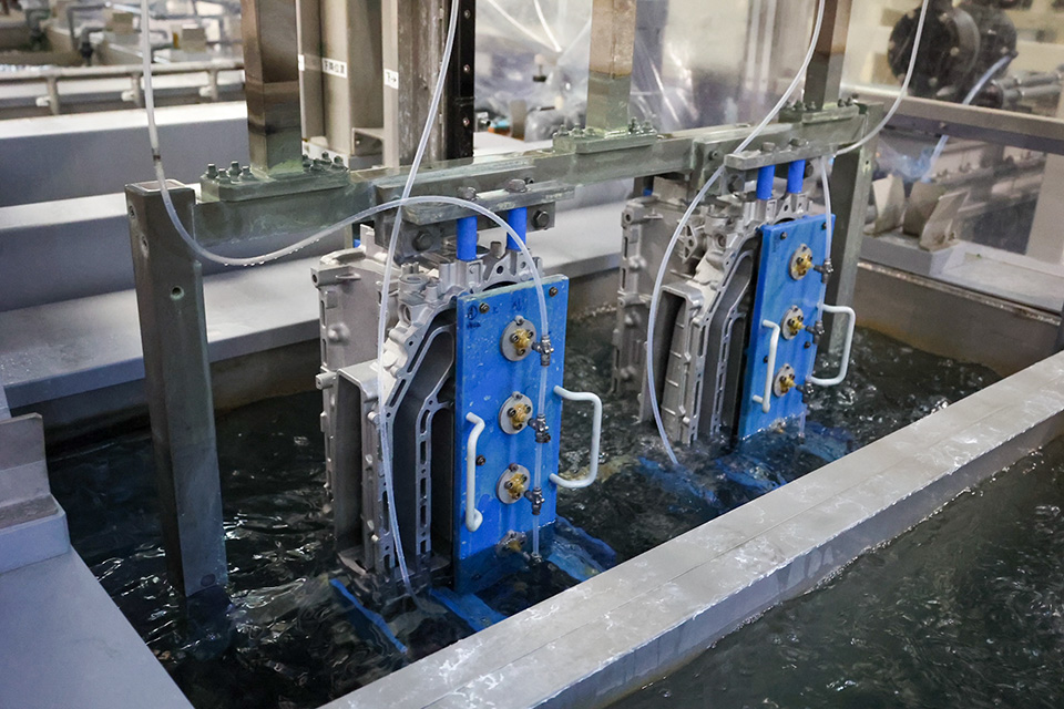 The Suzuki Edge eCoat process involves immersing aluminum components in an electrolytic solution and passing an electric current through it to create a porous layer on the surface. Corrosion resistance is enhanced by the formation of an aluminum oxide coating. By innovating the immersion process to prevent air pockets, Suzuki can uniformly treat the complex shape of cooling water passages.Superior heat resistance is another key advantage of this process. By employing a low temperature sealing treatment using metal hydrates to close the fine pores on the surface, Suzuki can maintain corrosion resistance even when exposed to temperatures of 300 degrees Celsius (572o F). This treatment is the first of its kind to be adopted for mass-produced outboard motor engine components. *1