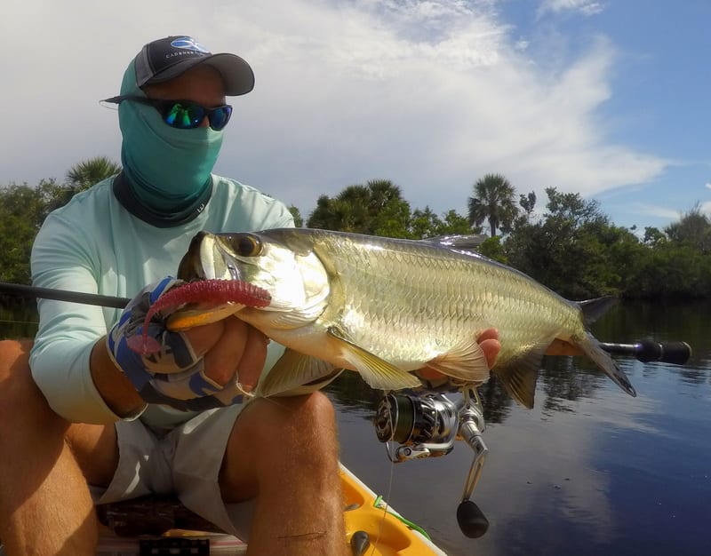 I love small jerk baits for tarpon but these can be tough to find. My all-time favorite is the three inch Shad Assassin by Bass Assassin. I’ve been using these for years and have caught hundreds of tarpon on them. I’ve also learned retrieving a small swimbait just under the surface can be deadly on tarpon, and the Oblivion Baits Deadswim is great for this technique.