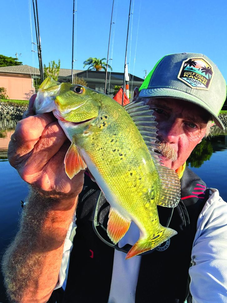 I’ve been so focused on fishing saltwater that I didn’t realize that the Cape has public freshwater launches all over the city. We met on a pleasant Sunday morning, and dropped our kayaks into one of these launches. This canal looks like every other canal system here, surrounded by residential homes and has a super healthy population of lily pads and other aquatic plant life. Johnny had mentioned that these Pea’s were taking top water plugs and that I should have a Chug Bug to start. As we settled into our kayaks at daybreak, he said we were headed to his “spot” but mentioned that the Pea’s could be anywhere. He had his first one on in less than a minute, meanwhile, I am an old largemouth bass nut and got one on my second cast. The thought cr ossed my mind that catching largemouth bass all morning couldn’t make me happier but we were here to target Pea’s. As we continued on down the canal Johnny was setting the example for me to follow and I didn’t quite have the right cadence down, so he’s catching Pea’s and I’m catching largemouths until all of a sudden, I got my first Pea hit and overreacted, missing the strike. Johnny told me to wait for the second strike as I reel in and sure enough the second hit comes and again I miss it. I’m still in largemouth strike mode but after multiple strikes and Johnny’s coaching I got my first Pea and she’s a beauty!