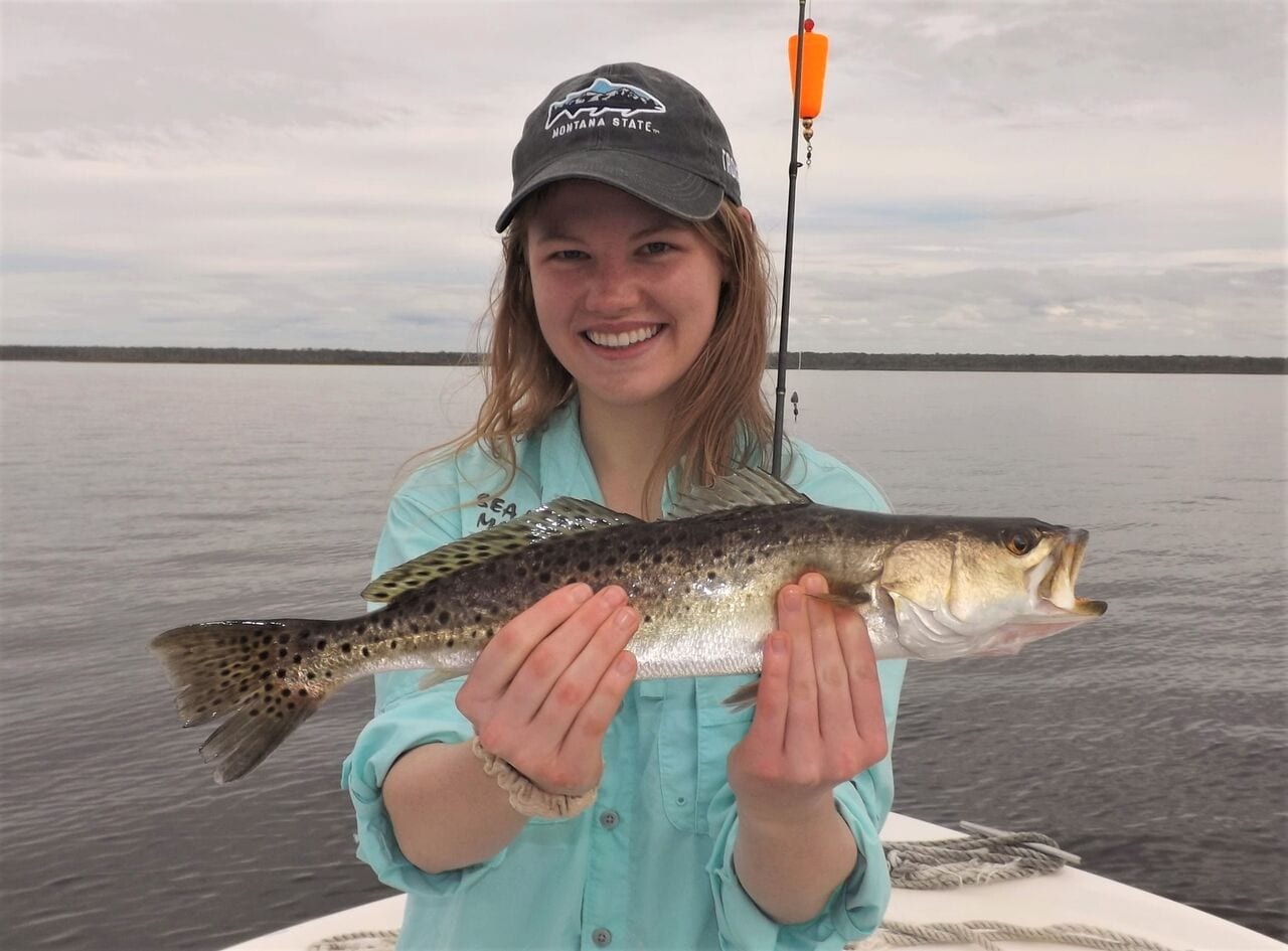 Trout fishing was fantastic yesterday (March 11th) as I took out Angie, Mike and Mackensie Hulse of North Ga, and we landed well over 80 trout bringing in 19 keepers. We fished in 3 o 4 feet of water, with mostly live Shrimp under Back Bay Thunders. Our last 5 to 6 fish came in on live pinfish, as I just had to catch a few and try them. Gulf water temps were up to 61.6 degrees, up from 56 earlier in the week, following a cold front. I also landed several nice trout on Assassin’s Wakasagi Elite Shiners rigged under an Original Cajun Thunder.