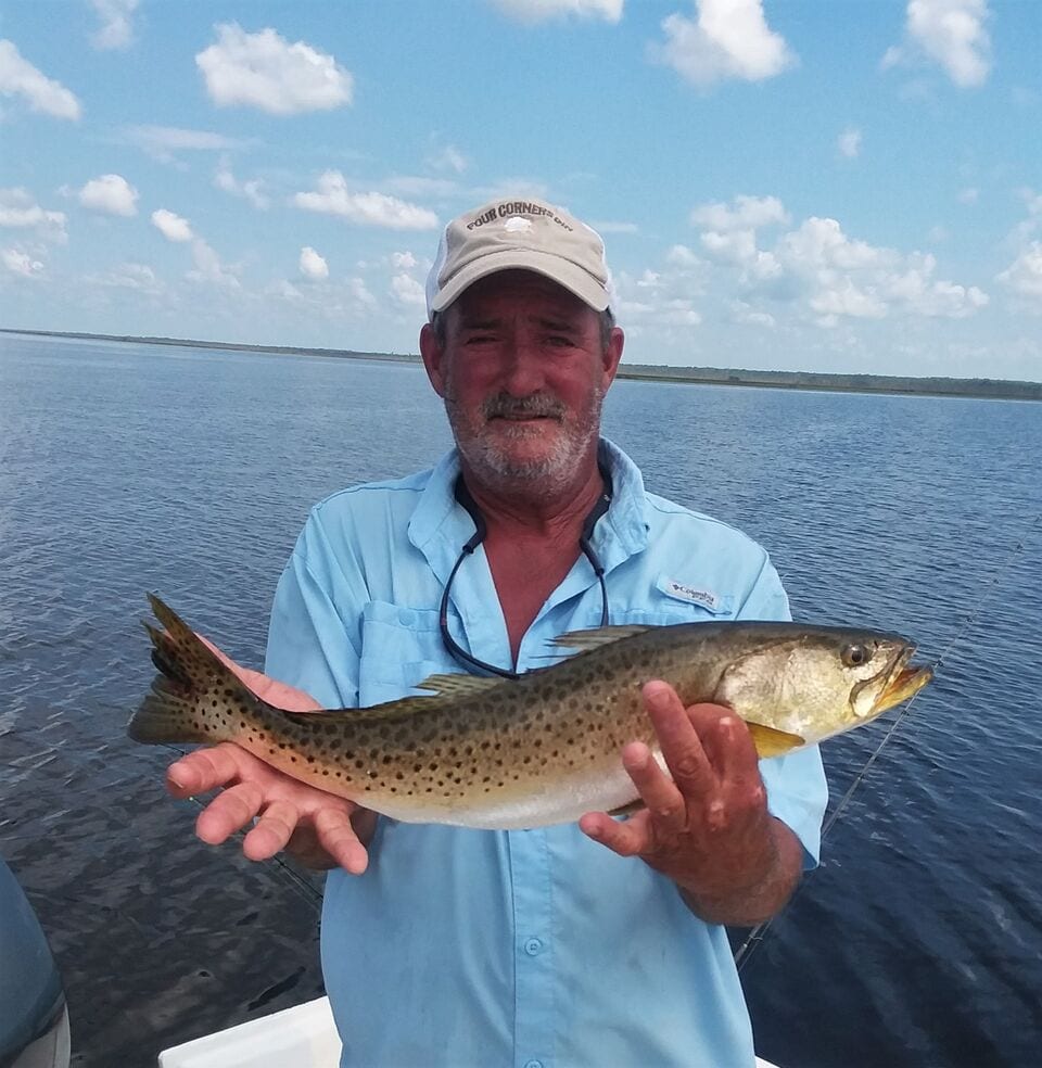 Trout fishing has been great, despite water temps in the mid 80’s, and when there is a breeze, the reds have been cooperative as well. My last two charters produced limits of both trout and reds, with an outstanding limit of 15 trout, weighing a whopping 33.7 lbs. for Sammy Rogers and Ricky Davis of Cochran, Ga. on July 10th. (Today is July 14th) We also had three reds with the largest, a 27-inch fish for Sammy. We also released a 29-inch red. We continue to catch our fish on live pinfish, rigged up on 32 inches of 30-pound test TrikFish clear mono leaders under Back Bay Thunders.