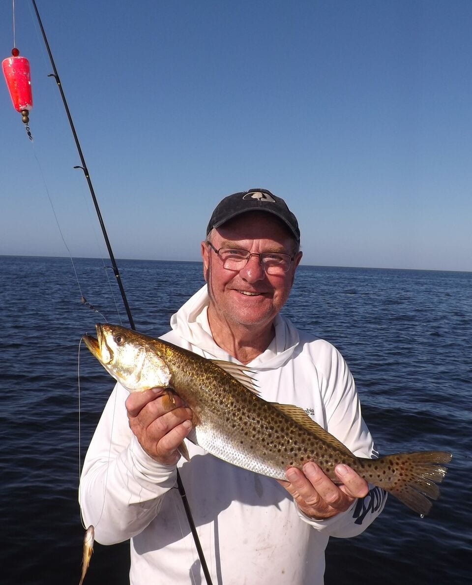 My trout fishing in October has been “Outstanding” so far, as we have taken limits of trout on every trip for five straight trips, and caught my charters their one red, apiece, the last few days we fished. The water temps have been as low as 81 degrees; yet were 89 just a week ago. We continue to take trout from 4.0 to 5.5 feet of water on the incoming tide. We have also taken nice trout on Assassin 5 inch shads in Croaker Shad, Limetreuse Ghost and Stinky Pink and on Assasssin Sea Shads in Acid Rain, Chartreuse/White (a brand New Color) and Sweet Pea. We have caught them up and down (as we used to say on the VHF radio) which meant, either with a Cajun, or without. The rest of our fish have been caught using live pinfish under Back Bay Thunders.