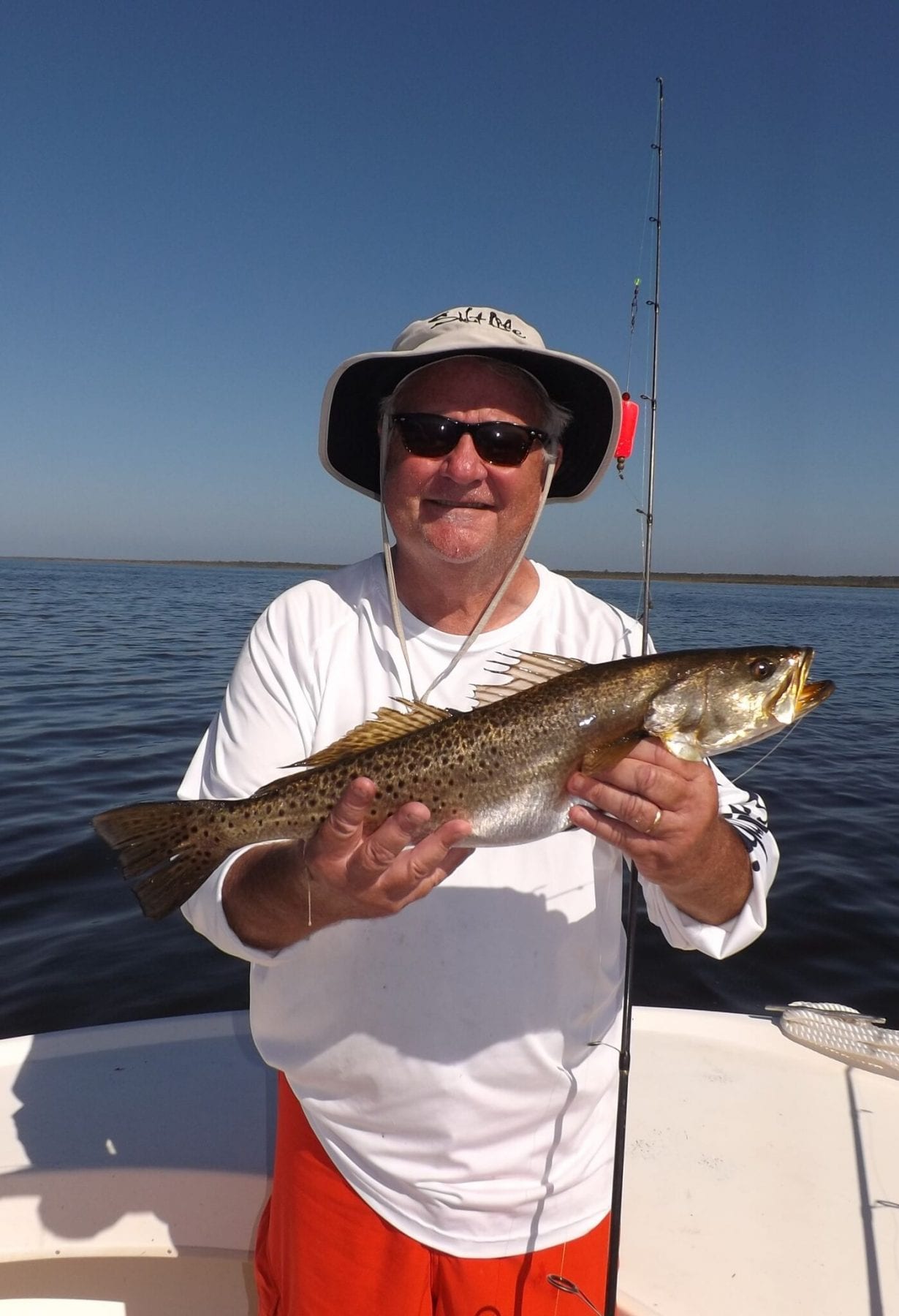 My trout fishing in October has been “Outstanding” so far, as we have taken limits of trout on every trip for five straight trips and caught my charters their one red, apiece, the last few days we fished. The water temps have been as low as 81 degrees; yet were 89 just a week ago. We continue to take trout from 4.0 > 5.5 feet of water on the incoming tide. We have also taken nice trout on Assassin 5” shads in Croaker Shad, Limetreuse Ghost and Stinky Pink and on Assasssin Sea Shads in Acid Rain, Chartreuse/White ( a brand New Color) and Sweet Pea. We have caught them up and down ( as we used to say on the VHF radio) which meant either with a Cajun or without. The rest of our fish have been caught using live pinfish under Back Bay Thunders.