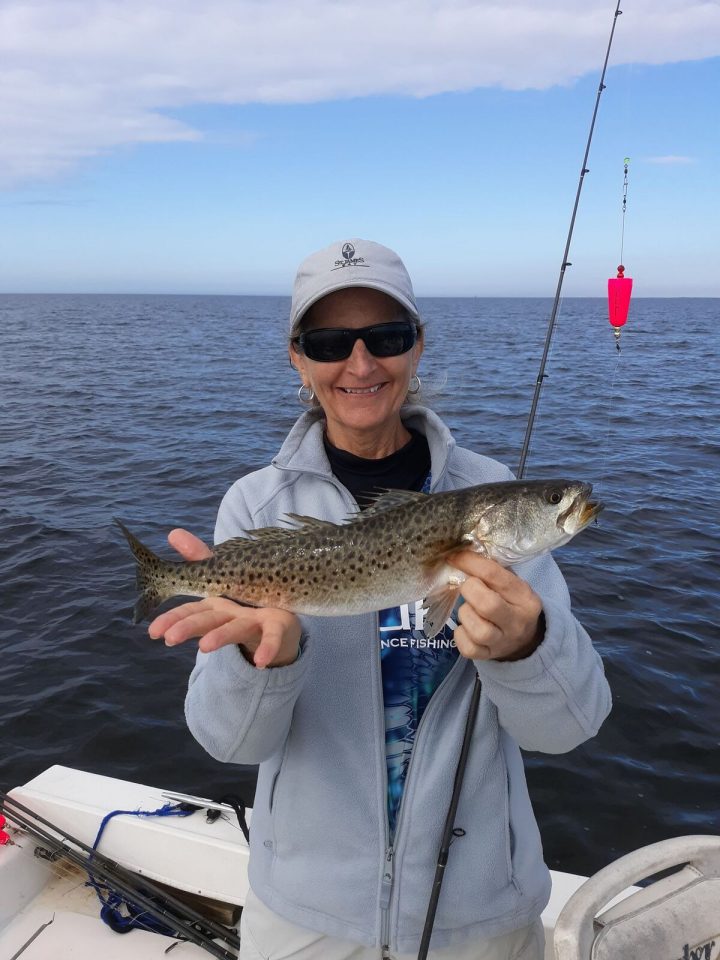 Our trout at Keaton were still out there in the open Gulf, and the bite seemed to be the best on the last two hours of the rising tide, and the first hour of the flop. A decent breeze has been a necessary component to a successful trip as well, as our waters were “too clear” most days, since we have been without any substantial rain in the last few weeks.