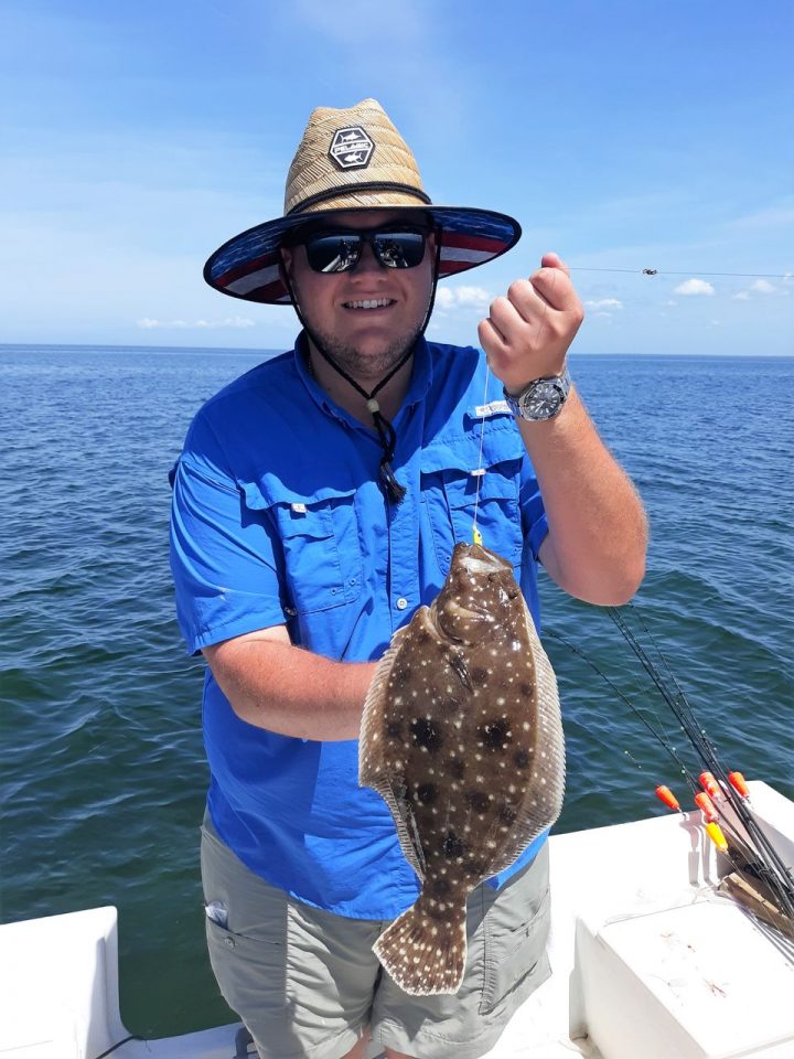 #4  Nathan Alexander with a flounder caught on Assassin’s Violet Moon 5 inch shad in 11 feet of water 5/17/20