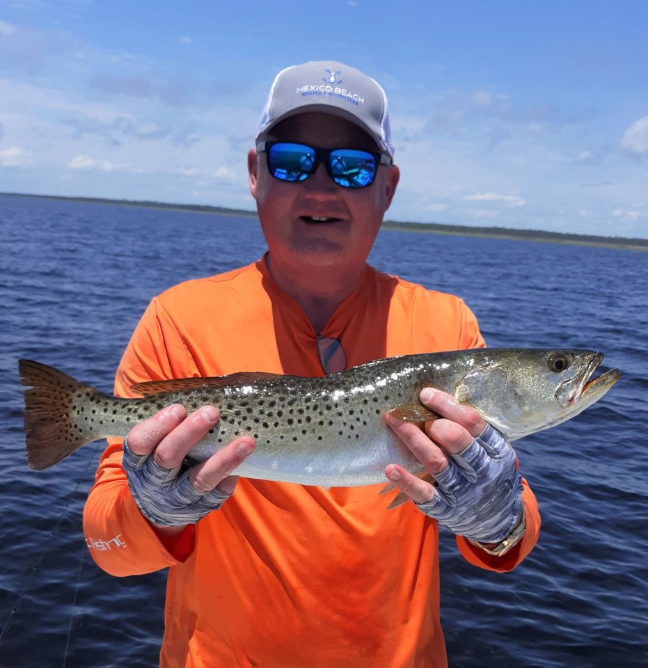 July will continue to produce trout on the offshore grass flats with live pinfish and pigfish which have spawned already, and some of their brood are large enough to fish with now. We caught a keeper cobia on a 7-inch pigfish the end May, for a young man on his first-ever trip to the Gulf. Trout out in the 7 to 10-foot depths, will eat Assassin 5-inch shads, bounced on Assassin New Penny, Electric chicken and Chartreuse flash 1/4 oz. jigheads.  Scallopers will be out there as of June 15th, and I love it, ‘cause they all go south and leave me alone.