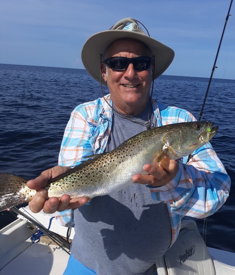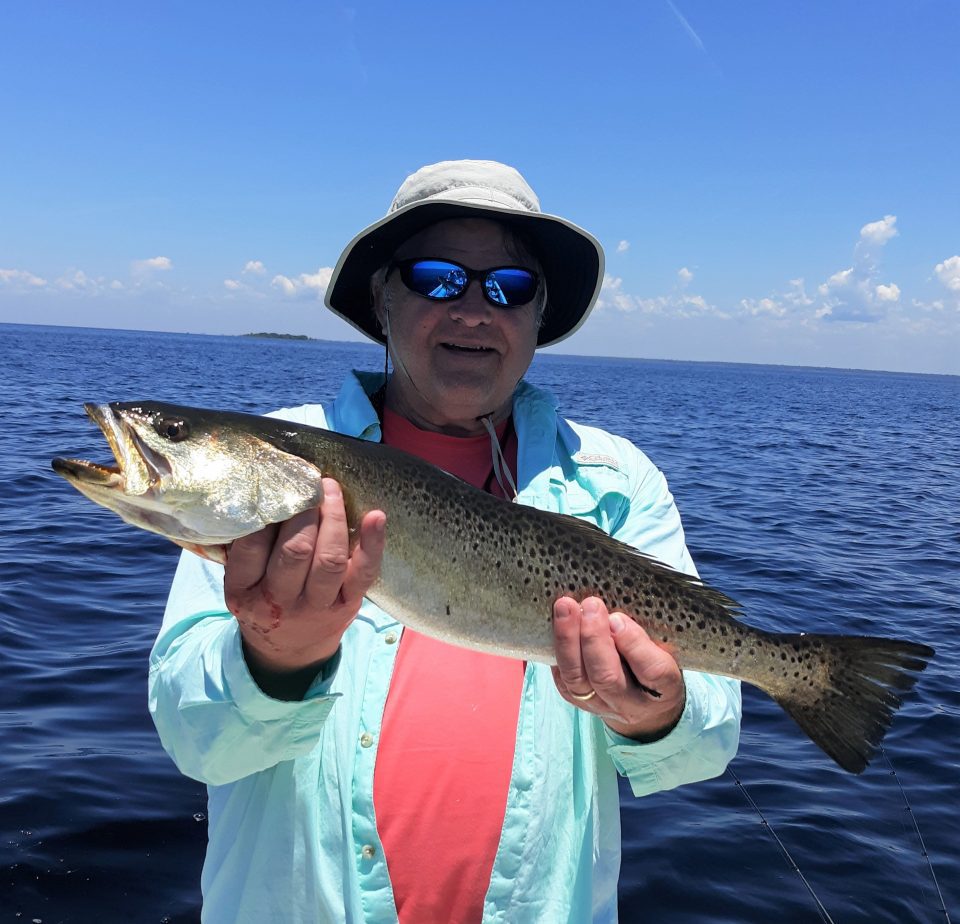 Trout continue to please my clientele, as we had a limit today (7/16/20) of ten trout for Joe Permuy from Jacksonville, and his guest from Atlanta, Ga. We caught our fish on live pinfish and pigfish rigged up under Back Bay Thunders in 4.5 to 5.5 feet of water. Our water temps here in this part of the Gulf are running 87 to 89 degrees!  We caught a bunch of catfish and lady fish in between trout, as they all were feeding in the same area on Ballyhoo and “whathaveyou”.  We barely had enough breeze from the ESE to drift, but it was sufficient to produce fish. We also caught a 15-inch sand trout, which ate a small live pinfish, which is rare, but not unheard of. Usually sand trout are taken with artificial baits or live shrimp.
