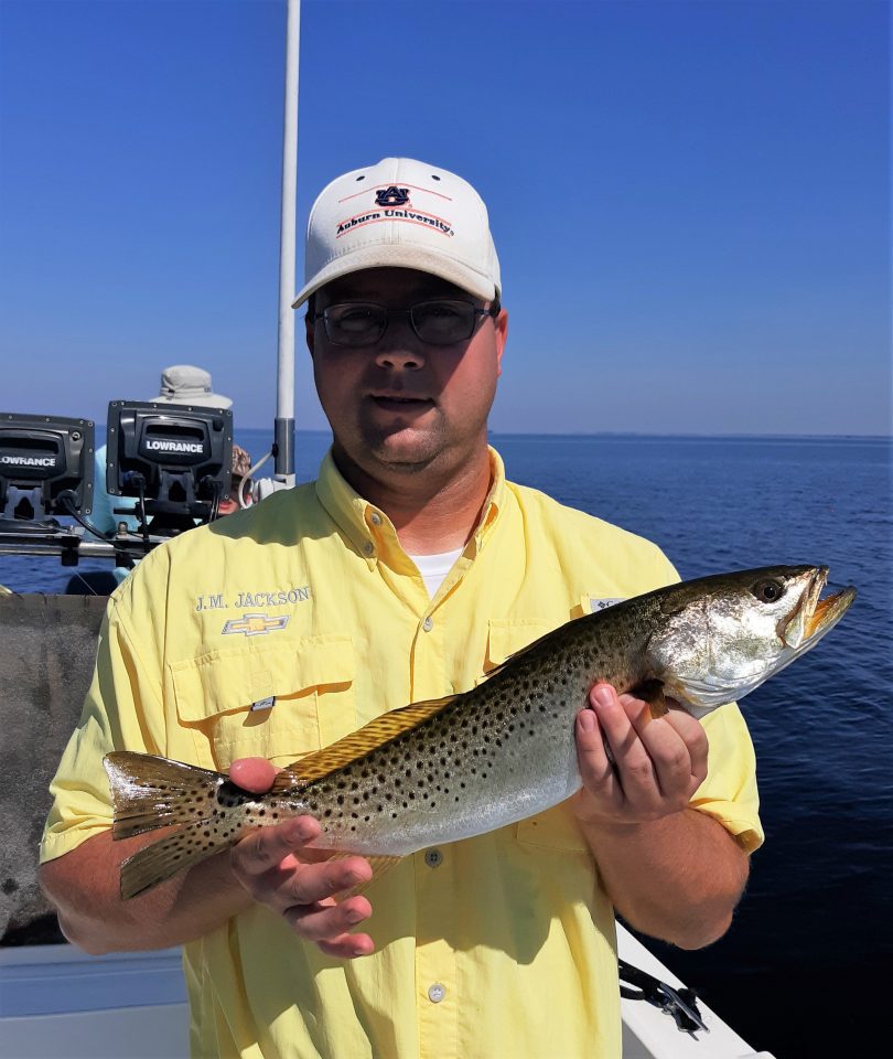 August patterns will be pretty much the same as July, with live pinfish taking more trout than jig and grub combos. If you just have to throw artificial at them, then rig an Assassin 1/16 oz. spring lock jighead, about 34 inches, under an Original oval Cajun Thunder and try a Wakasagi Elite shiner for your plastic. That way, the floating grass won’t be such a hassle.