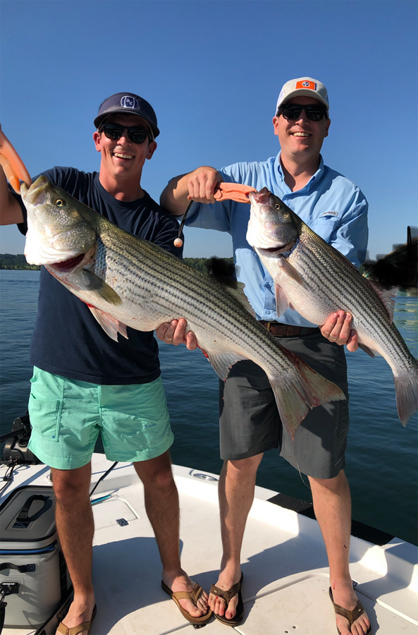 Lake Martin is alive and well as I write this ( 9/10/19 ) The top water action is on fire right now both with stripers and spotted bass . In September so far we have boated them as big as 20 lbs on top water lures and as big as 37 lbs trolling . In regards to the bass bite ( which all of you know that’s not the species I target ) my bass angler friends are catching 5 fish limits with a consistent weight of 16-20 lbs total along with some 4 – 5 lb pigs . This top water bite is not just happening at day break but has been good all thru the day especially if you have a little breeze on the water.