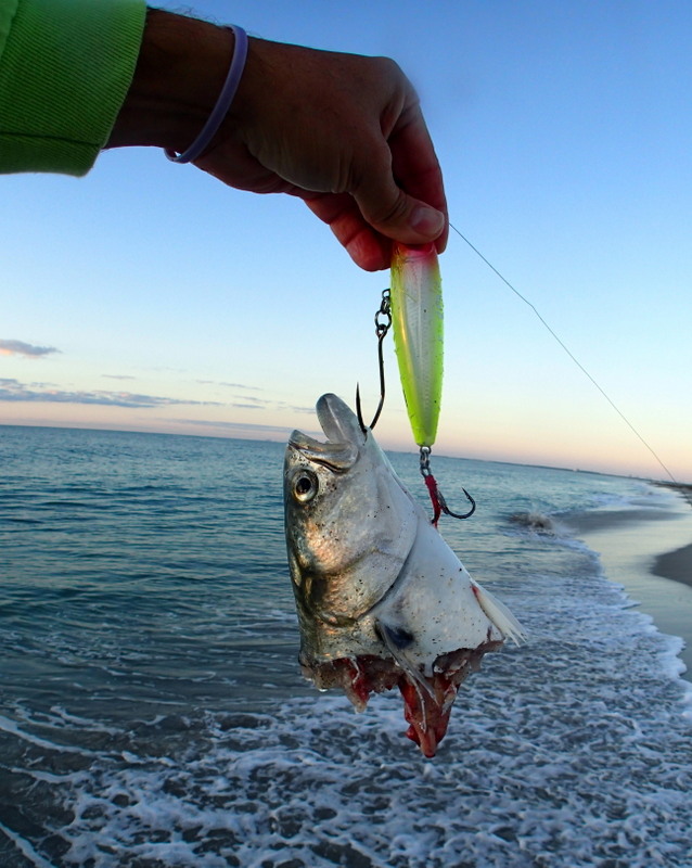 How: Just about any bait or lure that resembles a mullet will get eaten during the mullet run. A live finger mullet is a no-brainer. Pin it to a 2/0 to 5/0 Daiichi circle hook tied to a couple feet of 50-60 pound mono or fluorocarbon leader and use a sinker just heavy of enough to keep it on the bottom. Dead finger mullet and mullet chunks work almost as well as a livie, and any mullet imitating lure will work. I tend to favor plugs and spoons most days over soft plastics as there are usually plenty of bluefish, mackerel and other sharp toothed predators to shred up your supply of soft baits.