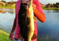 Bob Carbone caught this lunker bass in the community lakes at Four Season West Delray Beach on a hula popper at dusk