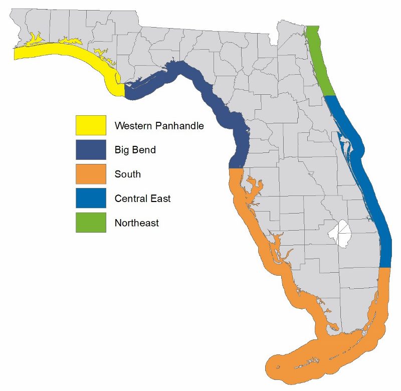 Big Bend: Remaining portion of Gulf County plus Indian Lagoon, and Franklin County through Fred Howard Park Causeway in Pinellas County near the Pasco County line