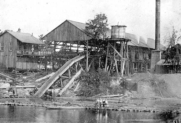 The floating dock at Branford has very tall pylons that allow the dock to rise during flood times and fall during normal river flow. The nearby former railroad depot has been converted into other, modern uses and stands near a bicycle path that also goes near the river. The old mill, as seen here in a photo from the 19th century, shows the long chutes that could carry lumber down to the river, where workers could float the logs down to other towns.