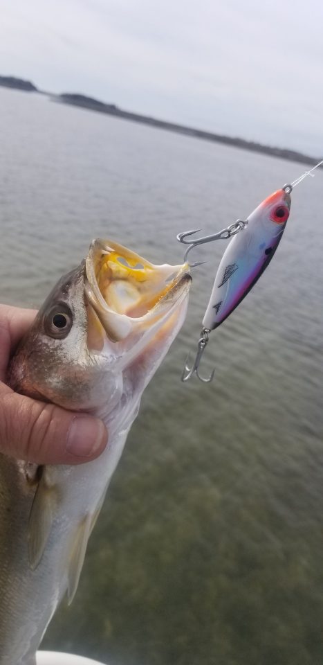 Black sea bass are on the reef structure offshore and will whack a jighead paddletail bounced off the bottom.
