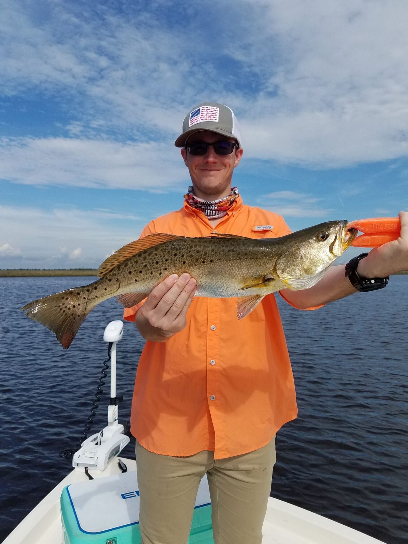 Pic #1- Colby Ackerman caught this nice 23″ 3.48lb trout on a bone One-Knocker Spook near St.Marks Lighthouse.