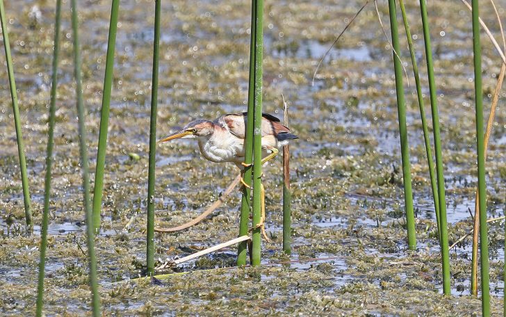 Hiding among the reeds and marsh grasses of freshwater bodies is a very reclusive bird called the Least Bittern. Least Bitterns are the smallest of the heron species found in North America. The bird has adapted to a life of hanging or walking on the grasses with large feet like a person on stilts. They are much more commonly heard than seen.