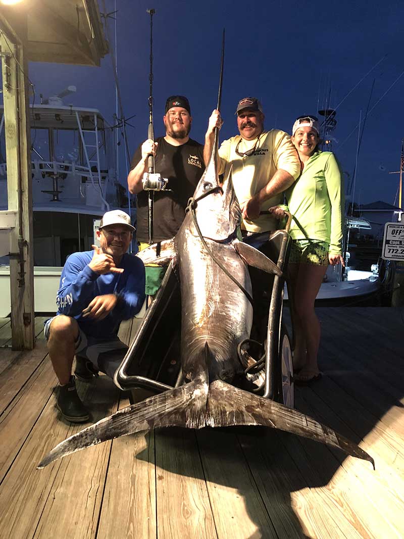 Nick, Mike and Amanda Welsh with one of two swordfish they caught daytime hand cranking aboard Off The Chain with Capt. Scott Fawcett. This is not for the faint of heart, but it is some of the most exciting fishing you’ll ever do. Photo credit: Capt. Scott Fawcett/Off The Chain Fishing Charters.