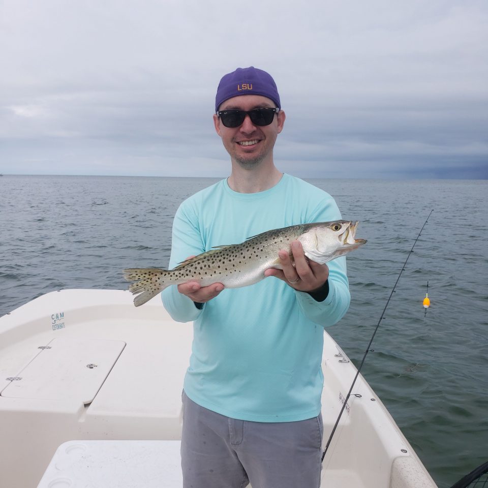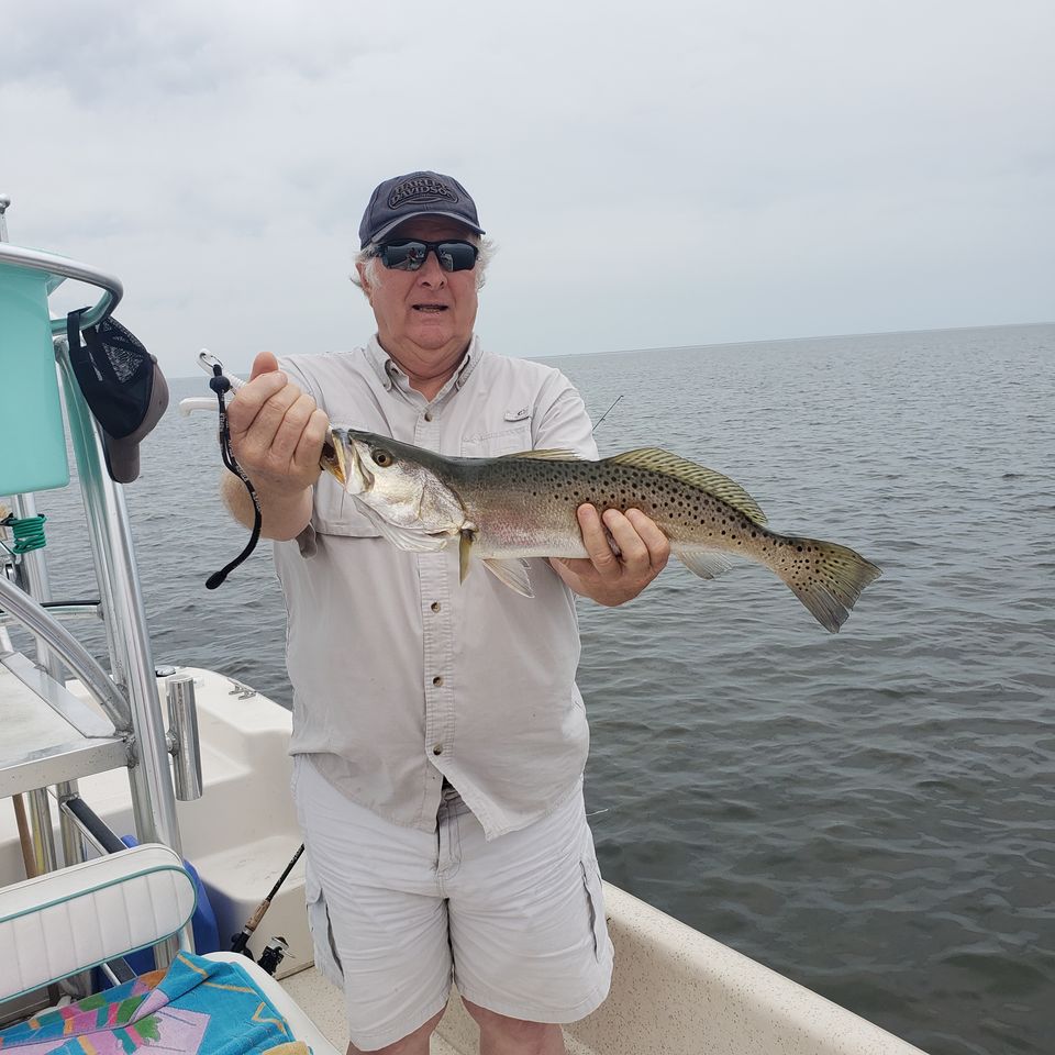 Let’s talk deep water trout fishing. I get asked all the time, how we catch trout when the water is warm. Well, the answer is pretty simple, lose the cork. When trout move deeper due to warming water temps, I tend to ditch the popping cork and just tie a c & m jig head on, with a swim bait of choice. I run out to some of the closer grassy reefs (8 to 12 feet of water) and jig the swim bait up and down off the top of the grass.