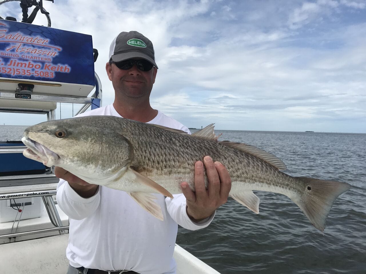 The redfish bite is still holding on, even though we aren’t getting the big schools of fish. Since the pin fish have slowed down a little, we have started to use both shrimp and cut mullet. The mullet, we fish right on the bottom still, and the shrimp we fish under a cork. We like to use the B52 cork as a 1/8oz Bass Assassin jig head. Remember, you don’t have to pop it as hard when you are using live bait and in skinny water. We are still catching fish around the islands on the incoming tide. The bars that have good shell bottom around them seem to be the best ones.