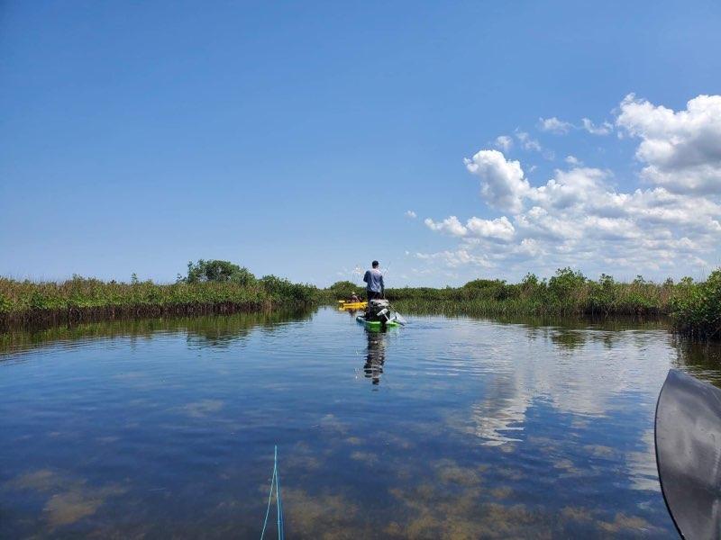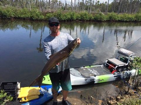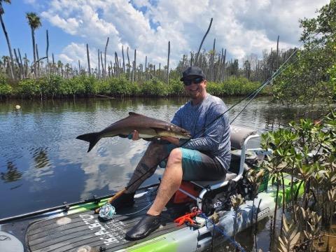 We set off early and had a mid-morning low, which is the tide I really like to fish. The brought a pair of Kaku kayaks, which is a hybrid style, so it’s a lot like a paddle board with a stadium seat, which is perfect for you fly guys. The only problem was, Jason seemed to be missing the C clamps for his seat, and he went in the drink twice. But I got to give him credit; he kept the rod out of the water! Why is it when I got a charter with my gear, and they flip, all they worry about is their sunglasses. Paddling out into Indian Bay, we worked the bigger bays and out toward Cabbage Island before heading north, behind Indian key. Trout and little snook and the assorted Garbage Pail slam material came to play, but the reds were playing hard-to-get. We finally dialed them in along with probably 100 young snook, back in the northern marshes. The problem was, working a fly in a three to four-foot-wide creek with mangroves on either side. Okay, I’m not going to swear off fly fisherman, because Alex and Jason were great company, but it does seem to have certain inherent restrictions. (LOL.)