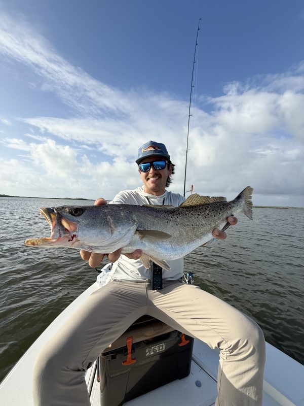 The morning started calm and quiet on Mosquito Lagoon — just a light ripple on the surface and schools of bait flickering in the first light. Working the edges of a grass flat, I tied on a 3-inch paddle tail and made a long cast into a pocket of nervous water. Within a few twitches of the rod, this big speckled trout exploded on the lure and peeled drag across the flat. After a few tense runs and a quick photo, she was safely released to keep the Lagoon’s legendary trout genetics alive.
