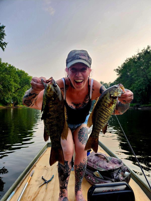 Meriah caught these two small mouth bass on a top water lure in one cast! Both treble hooks had a fish on when she reeled these in! They tied themselves around a tree under water, it took Meriah and her husband Ben to get them in the net and land them in the boat. Northern NY fishing in August!