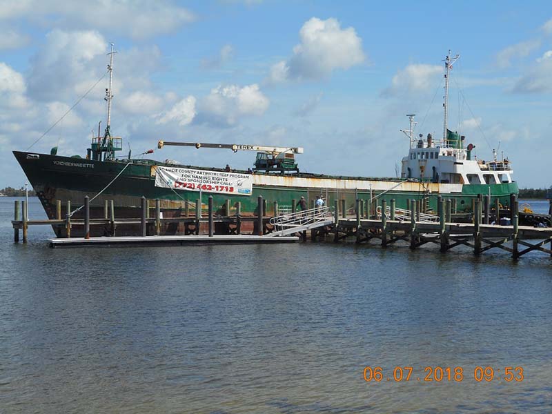 On June 7, McCulley Marine Services (MMS) towed the 180-foot coastal freighter Voici Bernadette from the Miami River to the Summerlin dock in the Fort Pierce Inlet to become St. Lucie County’s 52nd artificial reef deployment in the last 13 years. Earlier this year, the St. Lucie County Board of County Commissioners voted to accept this donation.